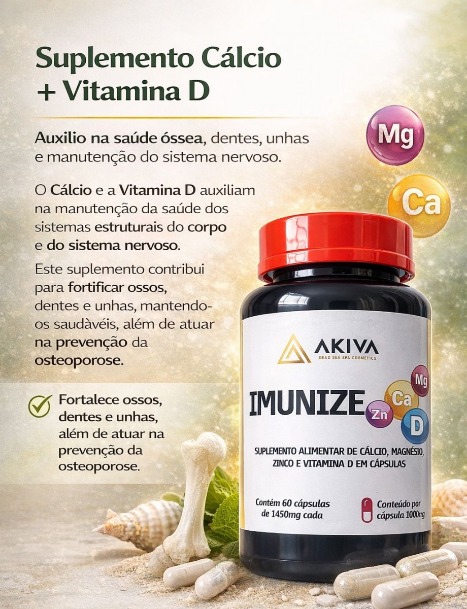 O Cálcio e a Vitamina D auxiliam na manutenção da saúde dos sistemas estruturais do corpo e do sistema nervoso. Este suplemento contribui para fortificar ossos, dentes e unhas, mantendo-os saudáveis, além de atuar na prevenção da osteoporose.