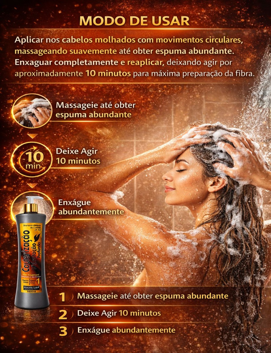 Modo de usar: Aplicar nos cabelos molhados com movimentos circulares, massageando suavemente até obter espuma abundante. Enxaguar completamente e reaplicar, deixando agir por aproximadamente 10 minutos para máxima preparação da fibra. Finalizar enxaguando abundantemente com água corrente.