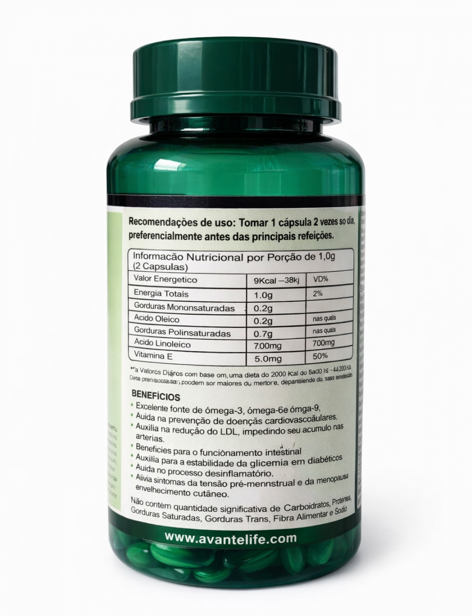 Suplemento rico em ácidos graxos essenciais para equilíbrio hormonal, saúde da pele e bem-estar.