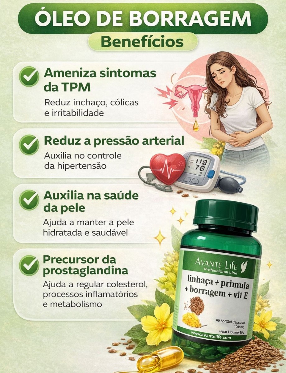 O Óleo de Borragem pode ajudar a amenizar sintomas da TPM, reduzir a pressão arterial e auxiliar na saúde da pele. Ele é precursor da prostaglandina, substância que regula processos metabólicos, colesterol e inflamações.