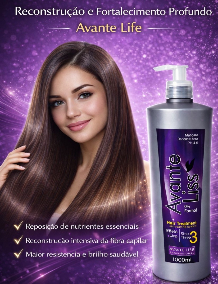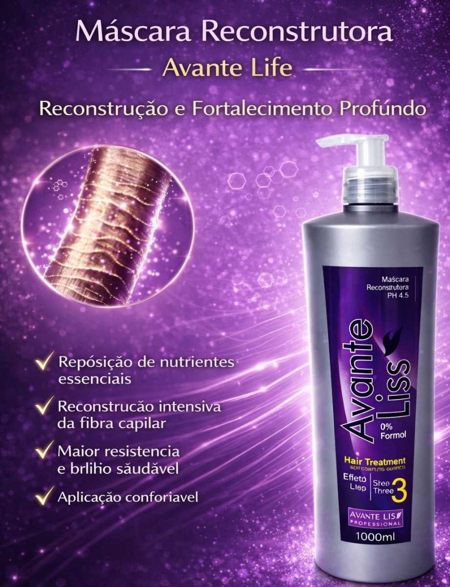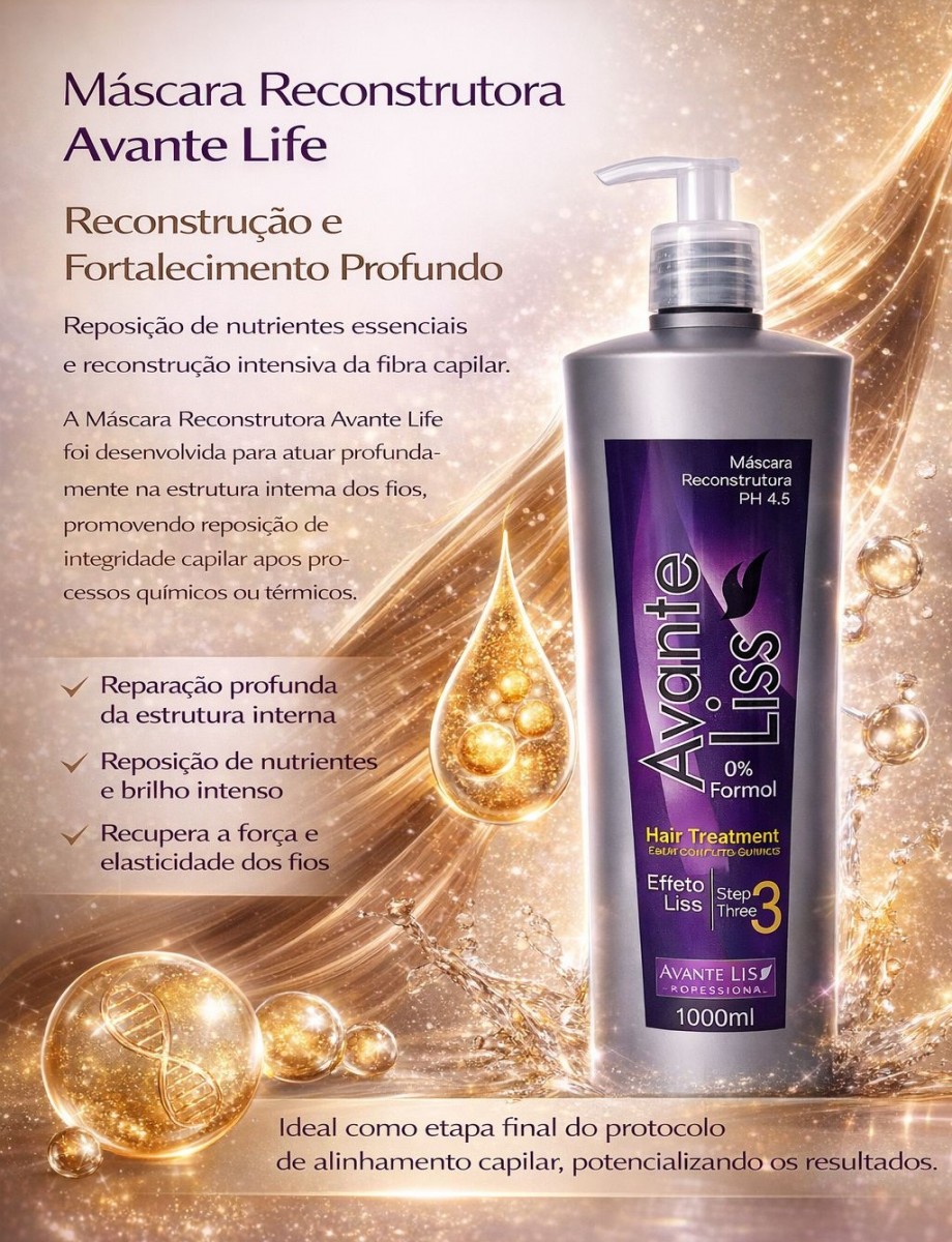 A Máscara Reconstrutora Avante Life foi desenvolvida para atuar profundamente na estrutura interna dos fios, promovendo reposição de nutrientes e restauração da integridade capilar após processos químicos ou térmicos.